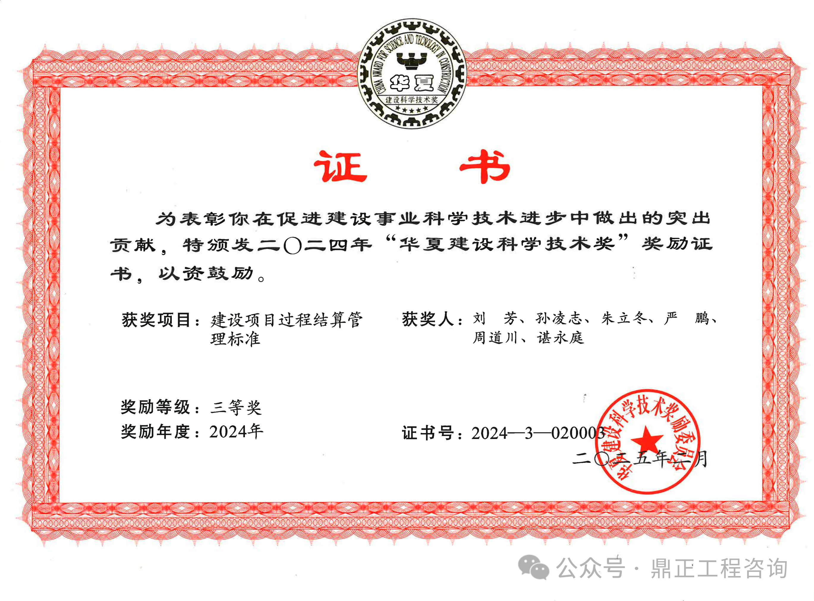 鼎正参与编制的《建设项目过程结算管理标准》(T/CECS 1178-2022)通过专业组和评审委员会的两级评审,从700余个报送项目中脱颖而出,荣获2024年度华夏建设科学技术奖三等奖。