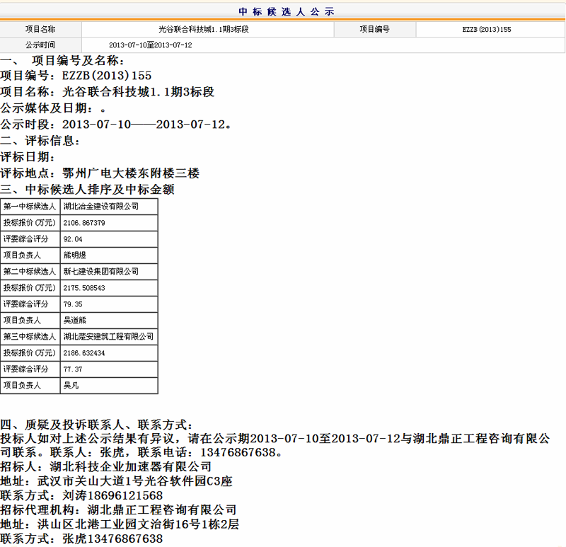 光谷联合科技城1.1期3标中标候选人公示