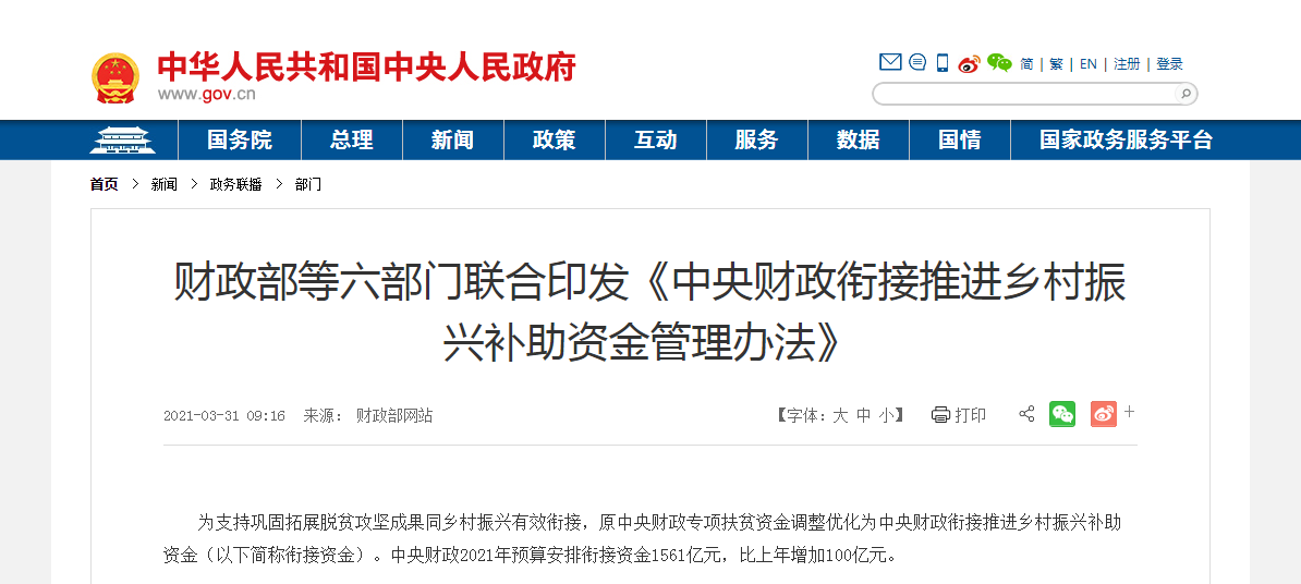 1561亿元乡村振兴补助资金怎么安排?管理办法来了