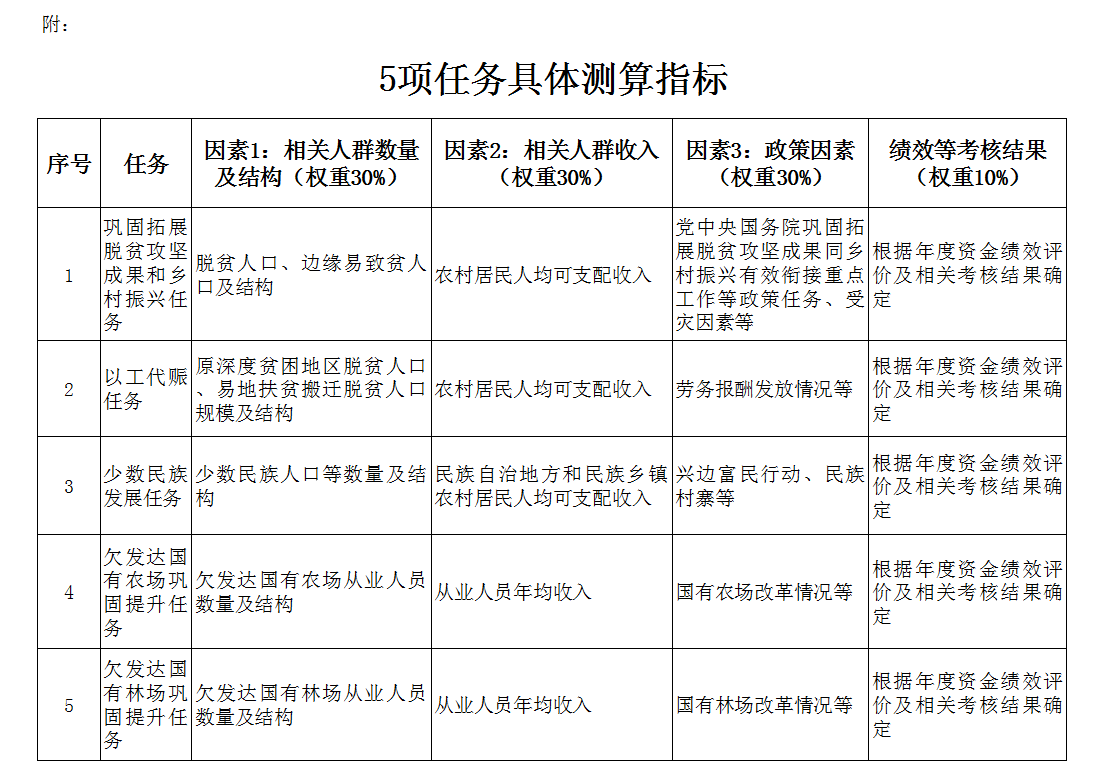 第二条 衔接资金按照巩固拓展脱贫攻坚成果和乡村振兴、以工代赈、少数民族发展、欠发达国有农场巩固提升、欠发达国有林场巩固提升、“三西”农业建设任务进行分配。资金分配按照因素法进行测算,因素和权重为:相关人群数量及结构30%、相关人群收入30%、政策因素30%、绩效等考核结果10%,并进行综合平衡。各项任务按照上述因素分别确定具体测算指标(详见附件)。“三西”农业建设任务按照国务院批准的规模安排。