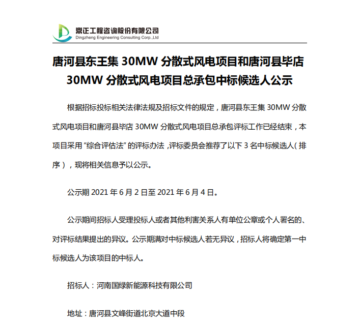 唐河县东王集30MW分散式风电项目和唐河县毕店30MW分散式风电项目总承包中标候选人公示