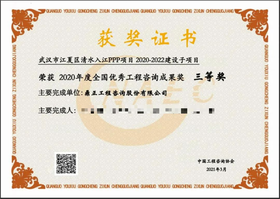 2021年3月5日,中国工程咨询协会公布了“2020年度全国优秀工程咨询成果奖”获奖项目名单,鼎正咨询继2019年全咨项目荣获全国优秀工程咨询成果奖后,又一PPP咨询项目——由鼎正咨询独立编制完成的“武汉市江夏区清水入江PPP项目 2020-2022建设子项目”实施方案再度荣获全国优秀工程咨询成果三等奖!