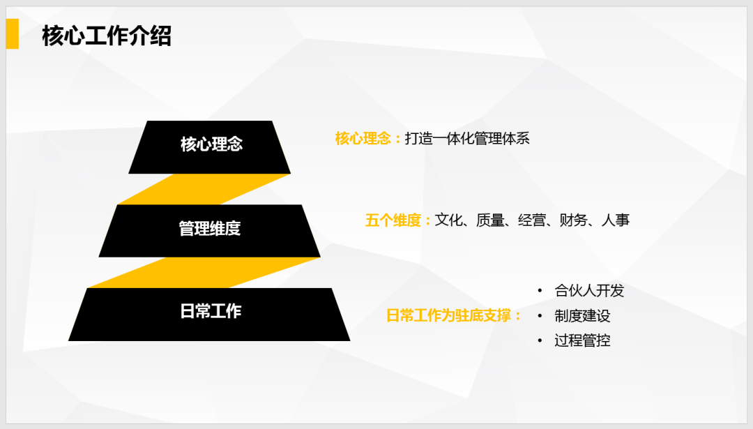 4、合伙人管理部:即将推进合伙人风控工作组工作,梳理总结,识别分析,从质量成果、档案用印、财务管理、税务筹划等方面入手,加强安全合规管理。
