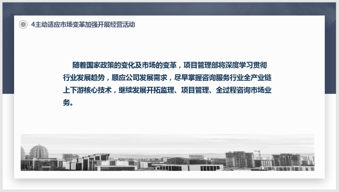 2、项目管理事业部:及时总结已完及在建全过程工程咨询项目管理经验,紧跟公司发展战略定位,不断提高工程咨询全产业链上下游核心技术水平,积极发展开拓工程监理、项目管理、全过程工程咨询业务。