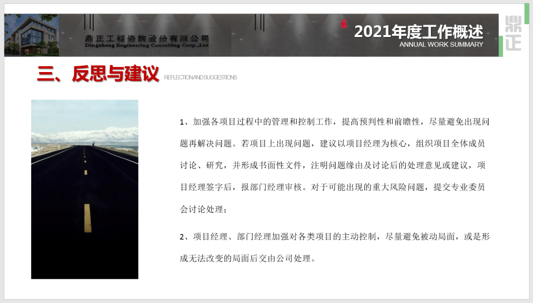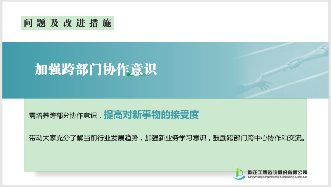 1、工程咨询事业部:持续保持积极向上的态度,从人才储备、资质资信、技术沉淀、经验积累等方面做了大量工作,为部门“十四五”发展做了充足的准备。