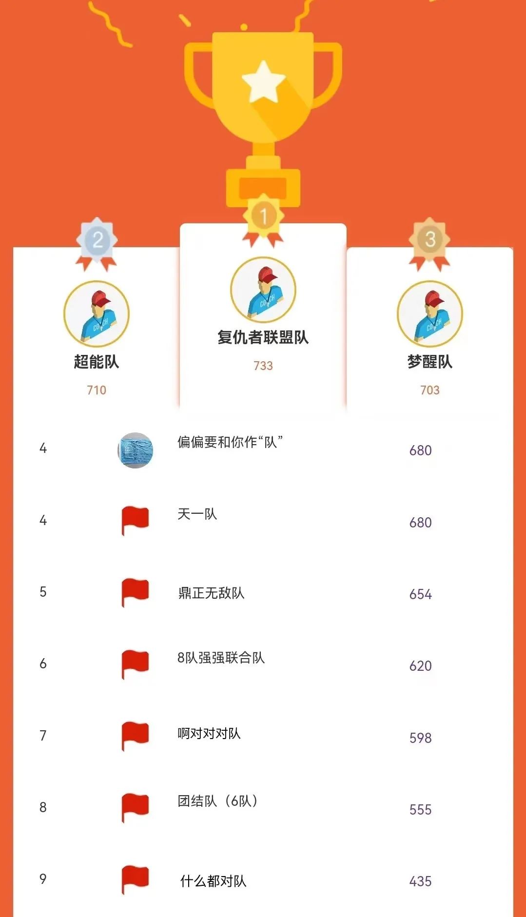 大家好,我们是“偏偏要和你作‘队’”、“强强联合队”、“复仇者联盟队”、“鼎正无敌队”、“啊对对对队”、“超能队”、“天一队”、“团结队”、“梦醒队”、“什么都对队”。