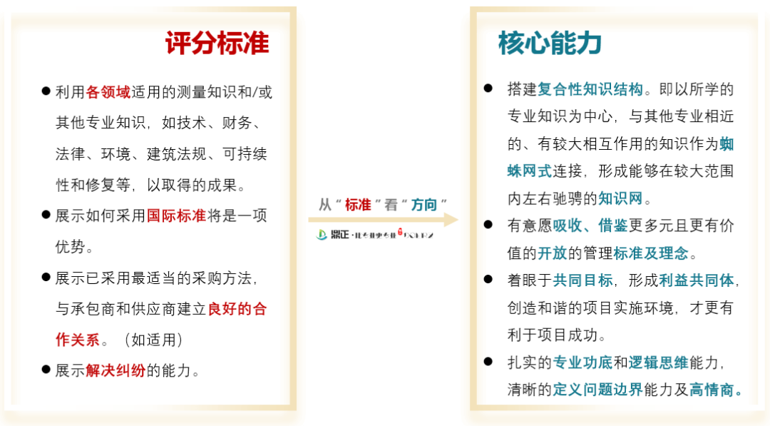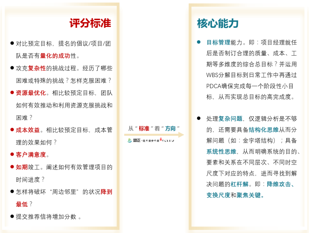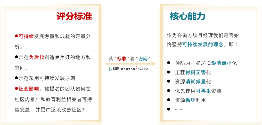 通过此次评奖申报过程中的思考与体会,我们想从RICS中国奖评分标准谈谈项目经理的努力方向。无论是投资决策咨询、规划设计,还是政府采购与招标代理、工程造价咨询、工程监理及项目管理咨询的项目经理,都需要明确‍优秀的项目管理是什么样的?要实现这些成果需要培养并精进哪些核心能力?