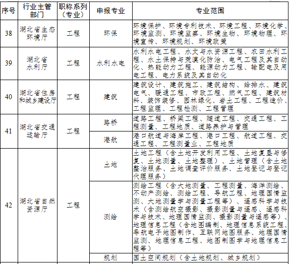 鄂职改办已下发《湖北省职称评审专业目录》(鄂职改办〔2021〕46号),其中工程系列已涵盖环保、水利水电、建筑、土地、测绘、规划等相关专业,详见下图: