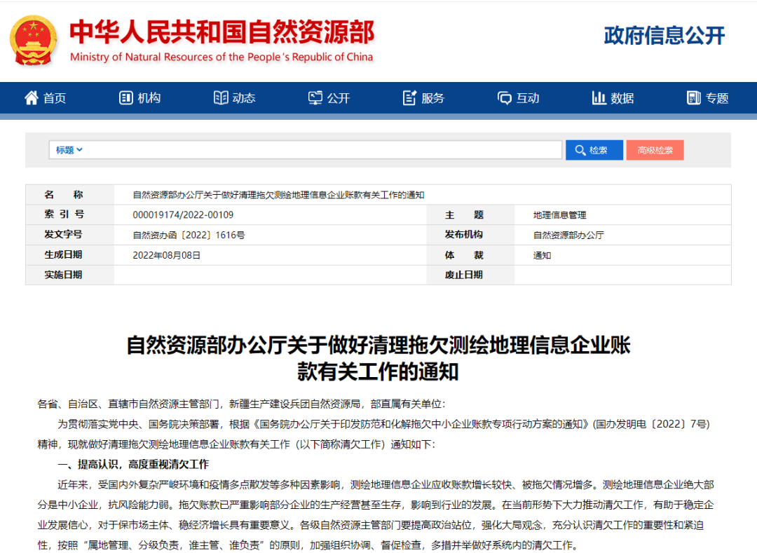 8月22日,自然资源部官网发布了《自然资源部办公厅关于做好清理拖欠测绘地理信息企业账款有关工作的通知》(自然资办函〔2022〕1616号),部署做好清理拖欠测绘地理信息企业账款有关工作。
