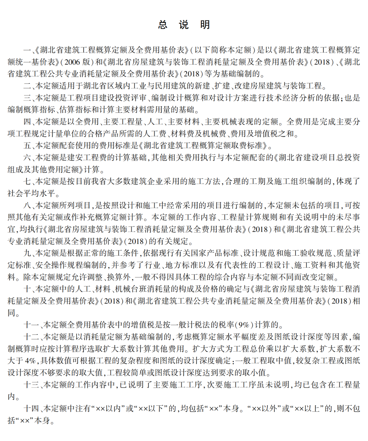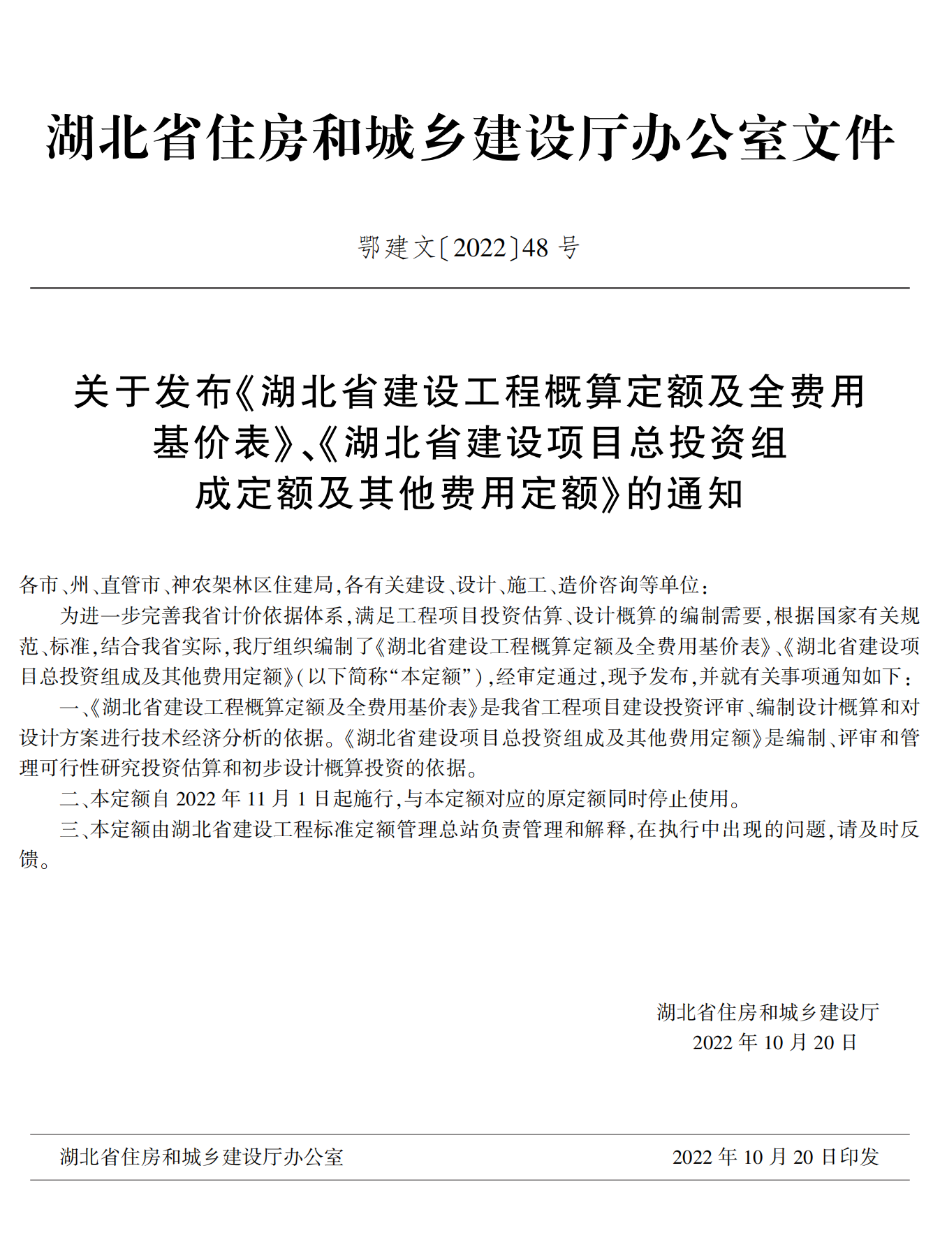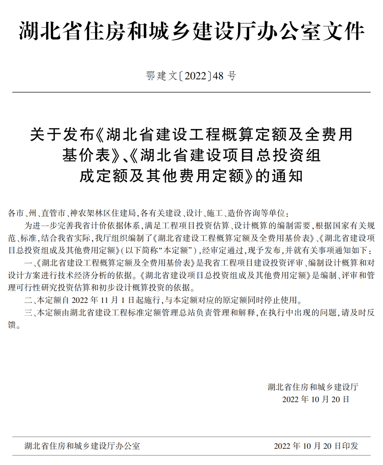 湖北省住建厅发布《湖北省建设工程概算定额及全费用基价表》《湖北省建设项目总投资组成及其他费用定额》的通知