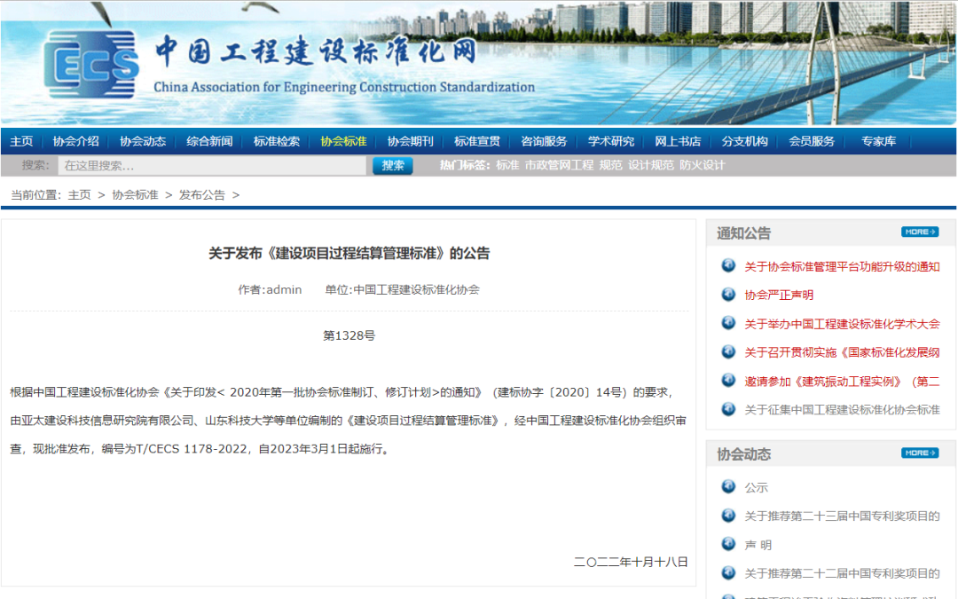 鼎正参编的《建设项目过程结算管理标准》(T/CECS 1178-2022)正式发布