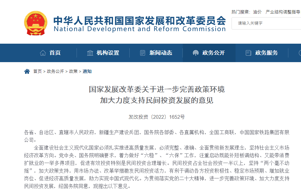 全面建设社会主义现代化国家必须扎实推进高质量发展,必须完整、准确、全面贯彻新发展理念,坚持社会主义市场经济改革方向。党中央、国务院明确要求,着力做好“六稳”、“六保”工作,注重启动既能补短板调结构、又能带消费扩就业的一举多得项目,促进有效投资特别是民间投资合理增长。民间投资占全社会投资一半以上,坚持“两个毫不动摇”,加大政策支持,用市场办法、改革举措激发民间投资活力,有利于调动各方投资积极性、稳定市场预期、增加就业岗位、促进经济高质量发展,助力实现中国式现代化。为贯彻落实党的二十大精神,进一步完善政策环境、加大力度支持民间投资发展,经国务院同意,现提出以下意见。