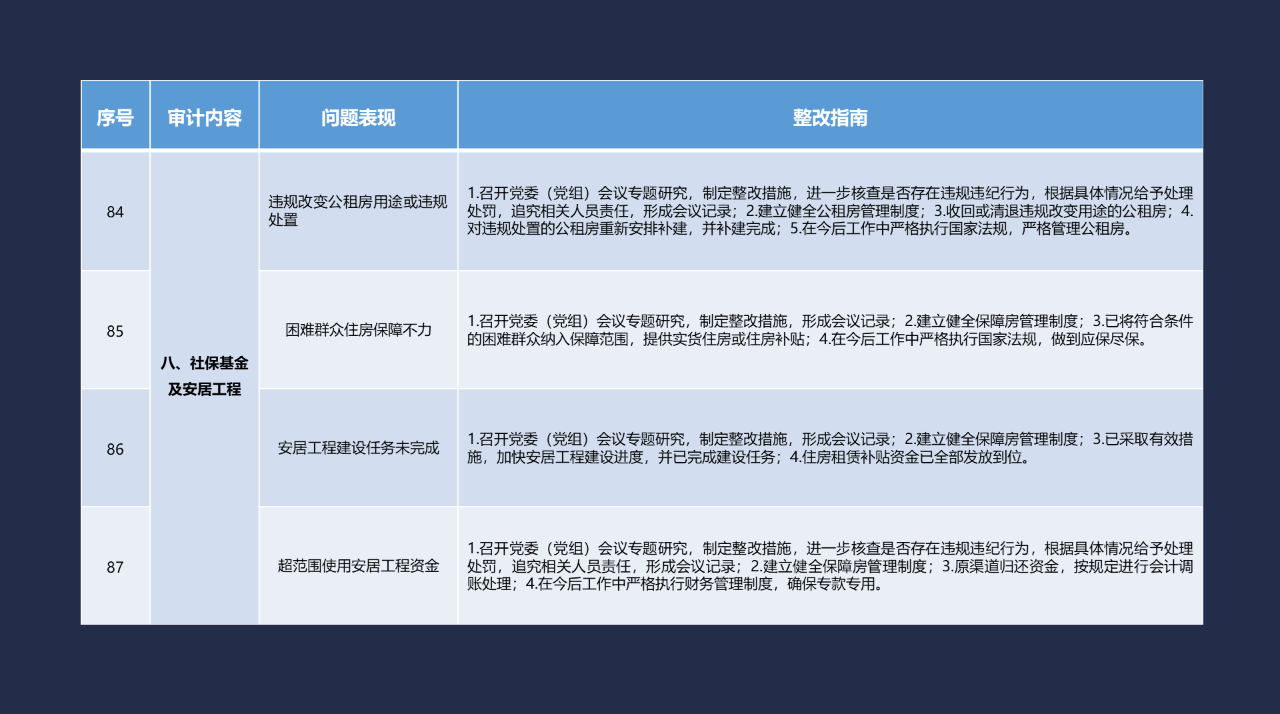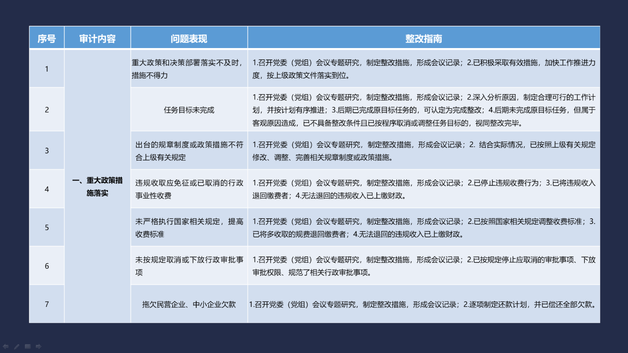《整改指南100条》按照常见的重大政策措施落实、预算管理、政府采购及招投标、基本建设、内控管理、企业管理、自然资源、社保资金及安居工程、金融管理、国外贷援款共10类审计内容进行问题分类,列举了100个常见问题并给出相对应的整改方法说明,供审计机关和整改责任单位在审计整改工作中参照落实。