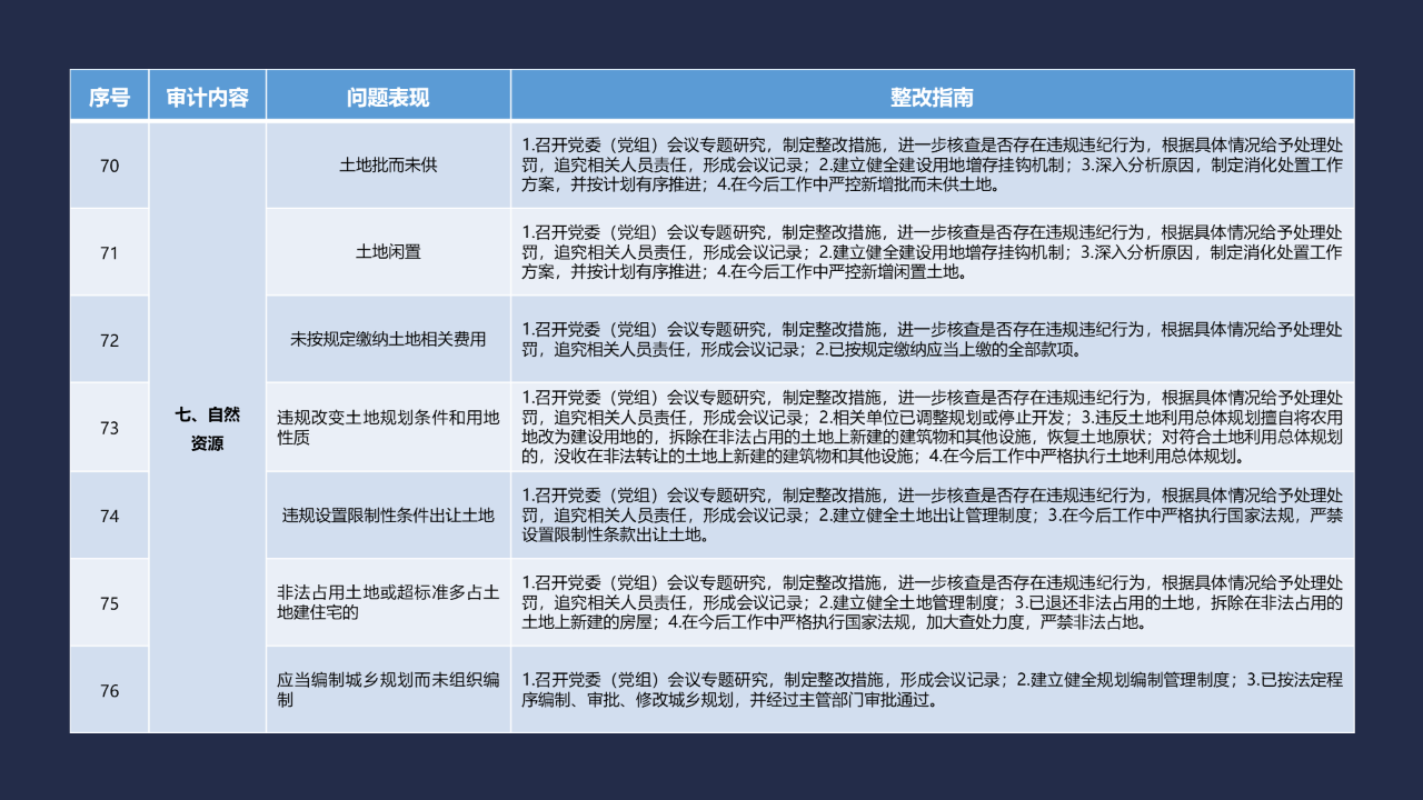 《整改指南100条》仅对审计整改的认定提供一般参考,每个问题的具体整改要求由审计机关在此基础上依据审计事实、问题情节和产生后果,在审计报告中予以明确。涉及上级审计查出问题的整改情况按照上级审计机关有关要求进行落实。