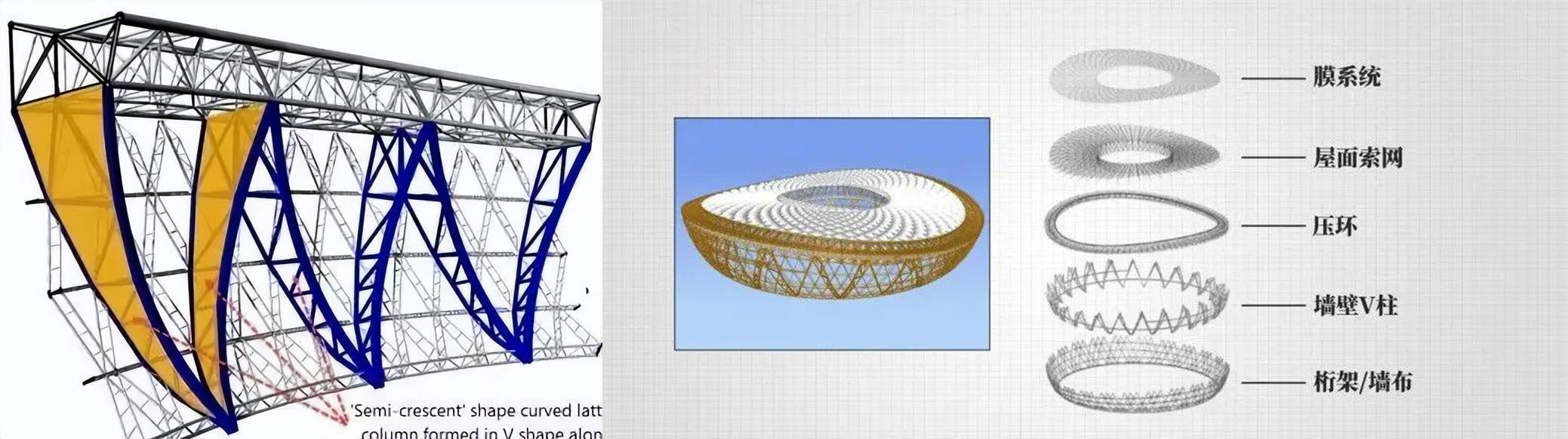 卢赛尔体育馆是全球最大跨度双层交叉索网屋面单体建筑,并且有着世界上最复杂的索膜结构体系,屋面索网结构跨度达274米,钢结构高空吊装最大的单体重达450吨,悬挑距离为76米,项目包含30多个专业大类,45个专项设计,99个电子系统,可以说是目前为止专业接口最多、技术最先进的体育场馆。