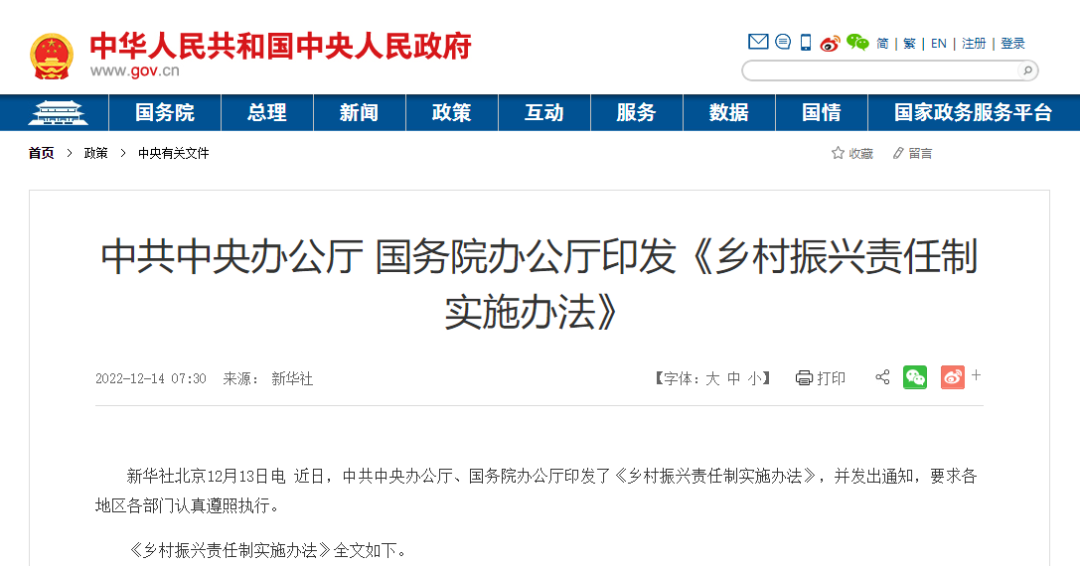 近日,中共中央办公厅、国务院办公厅印发了《乡村振兴责任制实施办法》,并发出通知,要求各地区各部门认真遵照执行。
