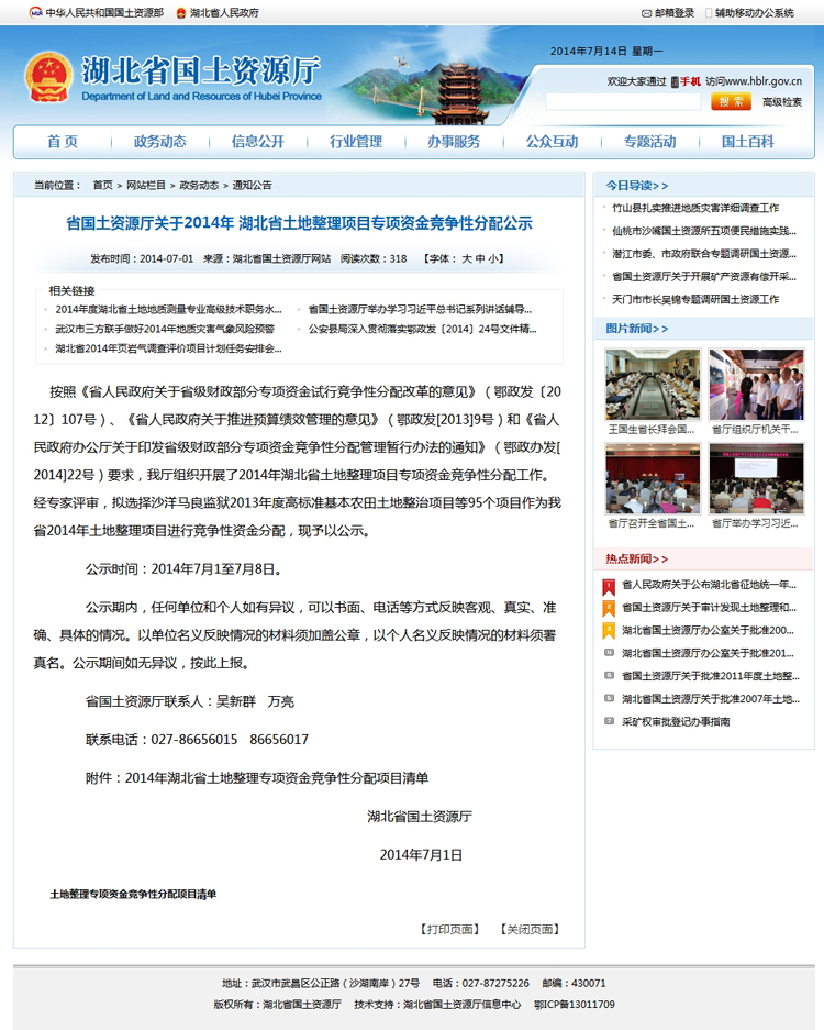 省国土资源厅关于2014年 湖北省土地整理项目专项资金竞争性分配公示
