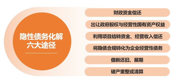 根据2018年8月财政部印发的《地方全口径债务清查统计填报说明》第十五条,隐性债务化解包括六大途径: