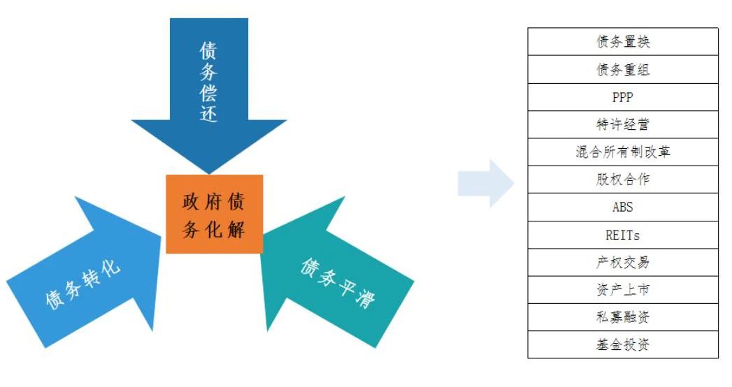 结合国家相关政策、学术理论以及实践经验,我们提出了围绕“债务平滑、债务转化、债务偿还”三大策略方向,主要运用“债务置换、债务重组、PPP、特许经营、混合所有制改革、股权合作、ABS、REITs、产权交易、资产上市、私募融资、基金投资”十二种工具,建立明确的债务化解规划,制定分年度债务化解目标,切实有效实现政府隐性债的化解,促进地方政府投融资运作健康可持续。