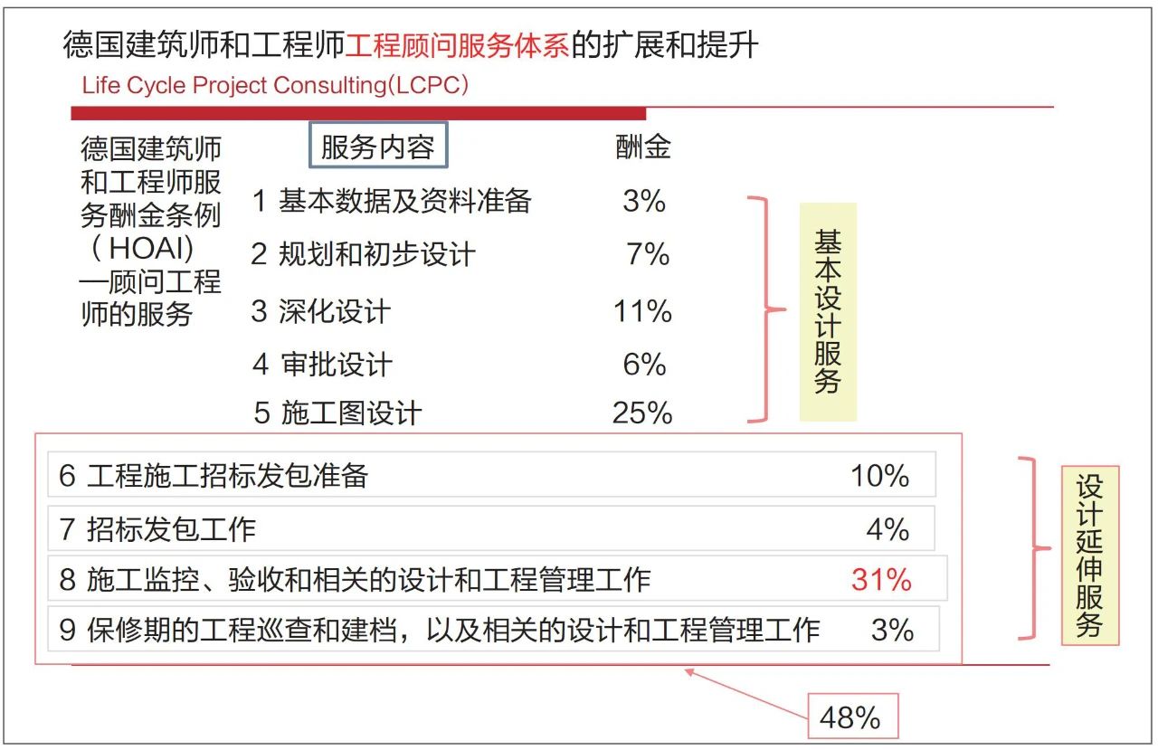 在德国,针对建筑师、工程师建立了一个工程顾问服务体系。德国建筑师和工程师的服务体系原来只有设计方面,就是设计公司、设计事务所主要是提供基本设计服务。近二三十年来,该服务体系在原来的基本设计服务基础上,作了设计延伸服务,又增加了四个方面的内容。