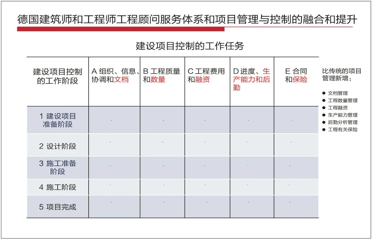另外,德国的建筑师和工程师服务体系中要求强化项目管理,对项目管理和设计进行融合。在项目控制方面,包括了5个阶段,需要做5方面工作,就是25项任务。比如,在设计准备阶段、建设项目准备阶段,要做组织信息协调、工程质量的准备控制、投资控制、融资服务、提供进度服务、合同服务等,这就把顾问服务和项目管理服务很好地结合了起来。