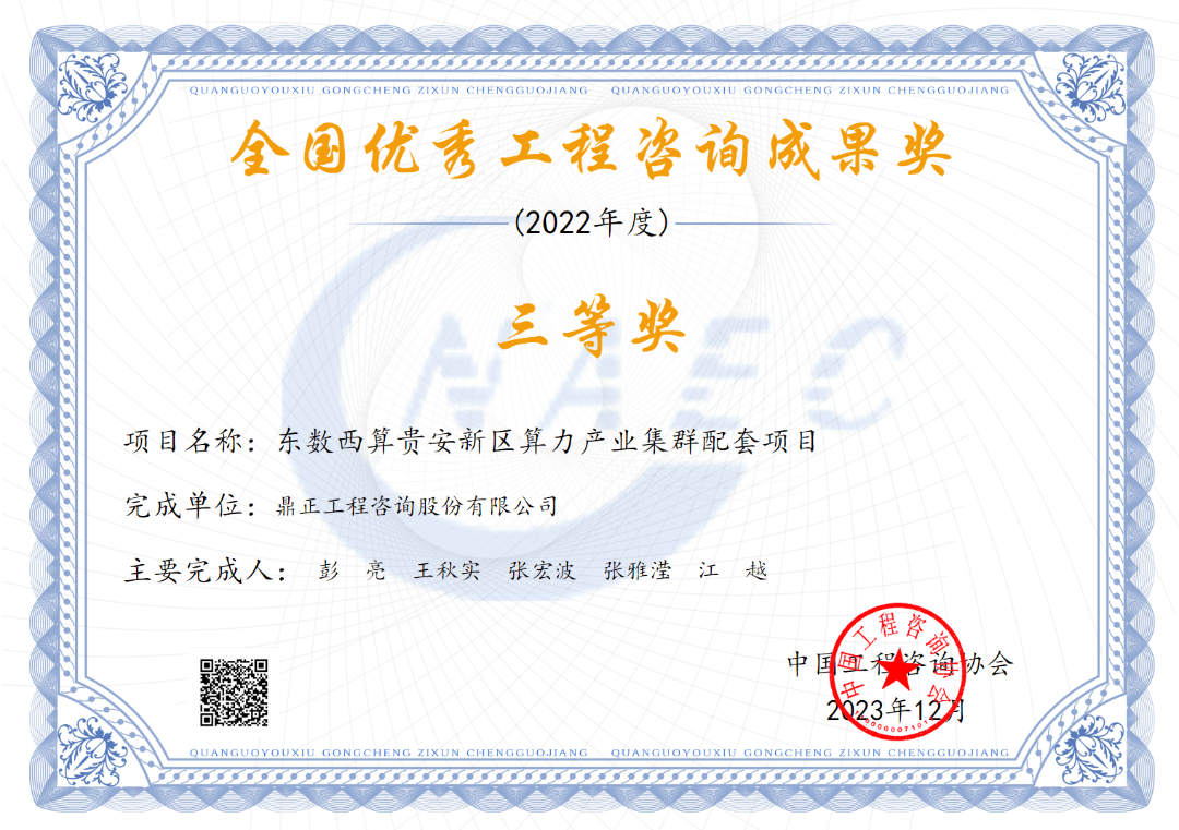 2023年12月29日,中国工程咨询协会公布了“2022年度全国优秀工程咨询成果奖”获奖项目名单,鼎正咨询编制的《东数西算贵安新区算力立业集群配套项目》荣获全国优秀工程咨询成果三等奖。