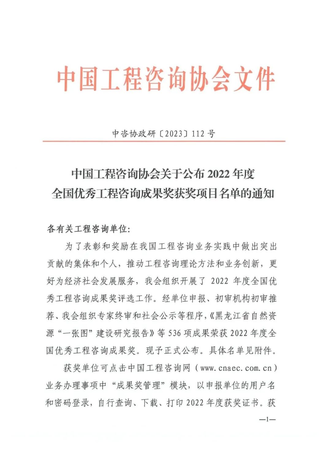 “全国优秀工程咨询成果奖”是中国工程咨询协会组织的全国性咨询成果评奖,旨在表彰和奖励在我国工程咨询业务实践中做出突出贡献的集体和个人,推动工程咨询理论方法和业务创新,更好为经济社会发展服务。
