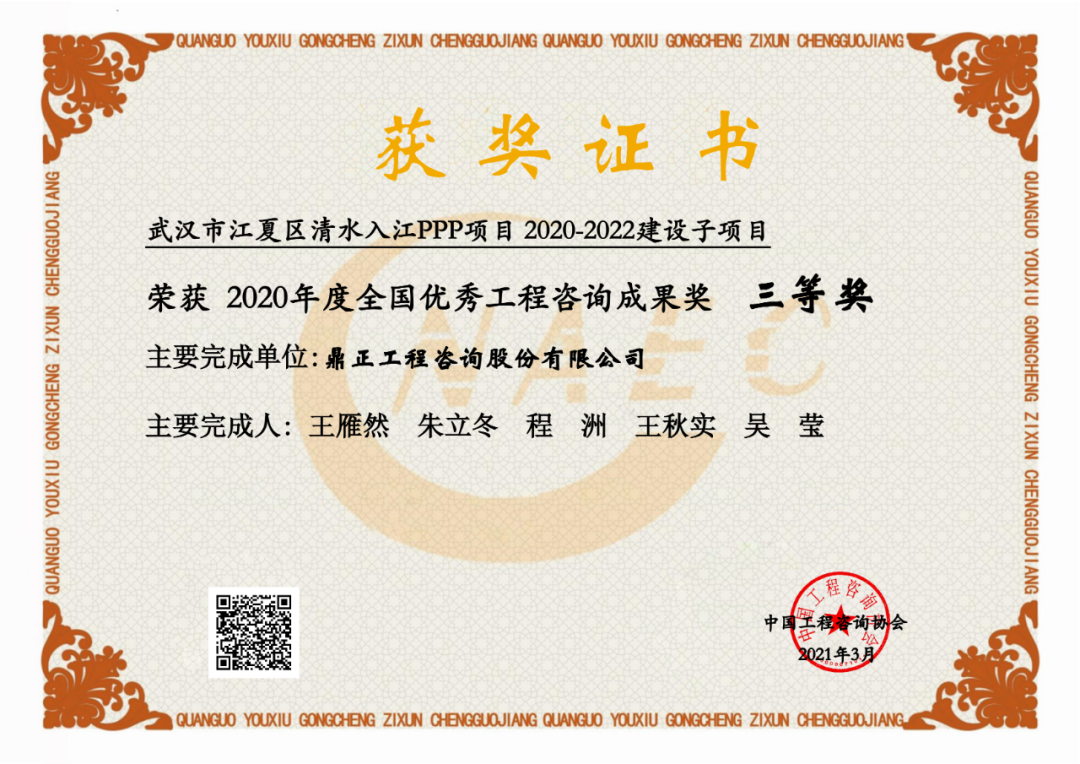 武汉市江夏区清水入江PPP项目深入践行“两山理念”,通过系统思维谋划,切实解决区域性环保问题,荣获“2020年度全国优秀工程咨询成果奖”三等奖,同时入选国家PPP示范项目。