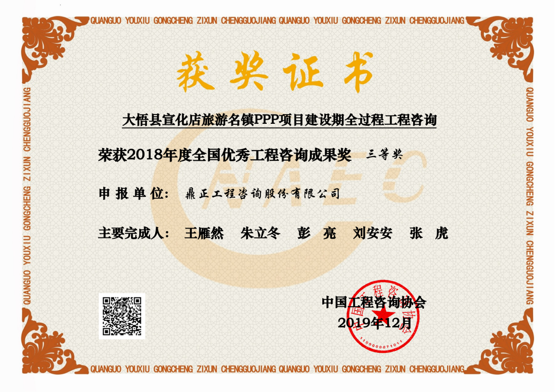 大悟县宣化店旅游名镇建设PPP项目开创湖北省全过程工程咨询之先河,荣获“2018年度全国优秀工程咨询成果奖”三等奖,同时入选第一批省级示范项目、第四批国家级示范项目。
