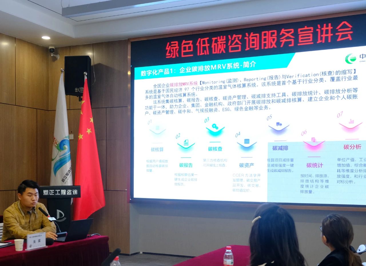产业与空间规划事业部吴琪,结合公司在工程领域的双碳研究成果和大量工程实践经验,从政策背景、核心优势、业务内容三个方面,全面而细致地介绍了《鼎正绿色低碳咨询服务产品矩阵》。