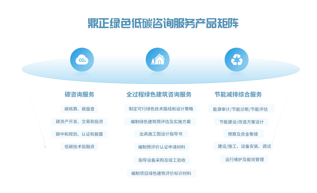 鼎故革新,正己守道。作为一家以创新驱动变革的工程咨询企业,我们密切关注国家前沿动态,紧跟国家政策,不断优化产品结构和服务模式。在“双碳”目标下,自2020起即针对工程领域的降碳、减排展开探索,协助政府统筹区域能源消耗,为碳指标交易及资产管理、绿色金融、政策法规等方面的规划作出指导,这为孵化绿色低碳咨询产品矩阵打下坚实的基础。