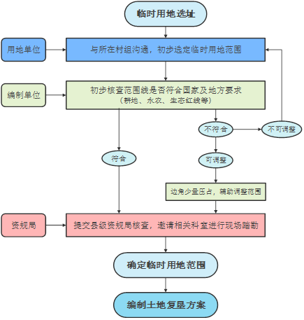 需先确定临时用地位置及范围,经自然资源主管部门核查确认后,再开展土地复垦方案编制、临时用地报批等后续工作,以防止项目开展后出现自然资源主管部门单位审批不通过或不了解项目情况、临时用地范围不可行等情况,导致项目停滞及反复沟通等问题。