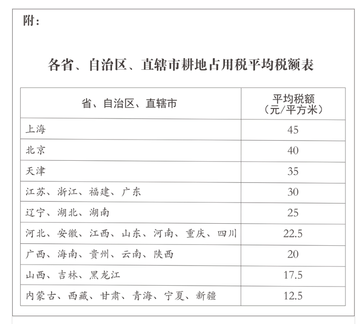 ▲各省、自治区、直辖市耕地占用税平均税额表