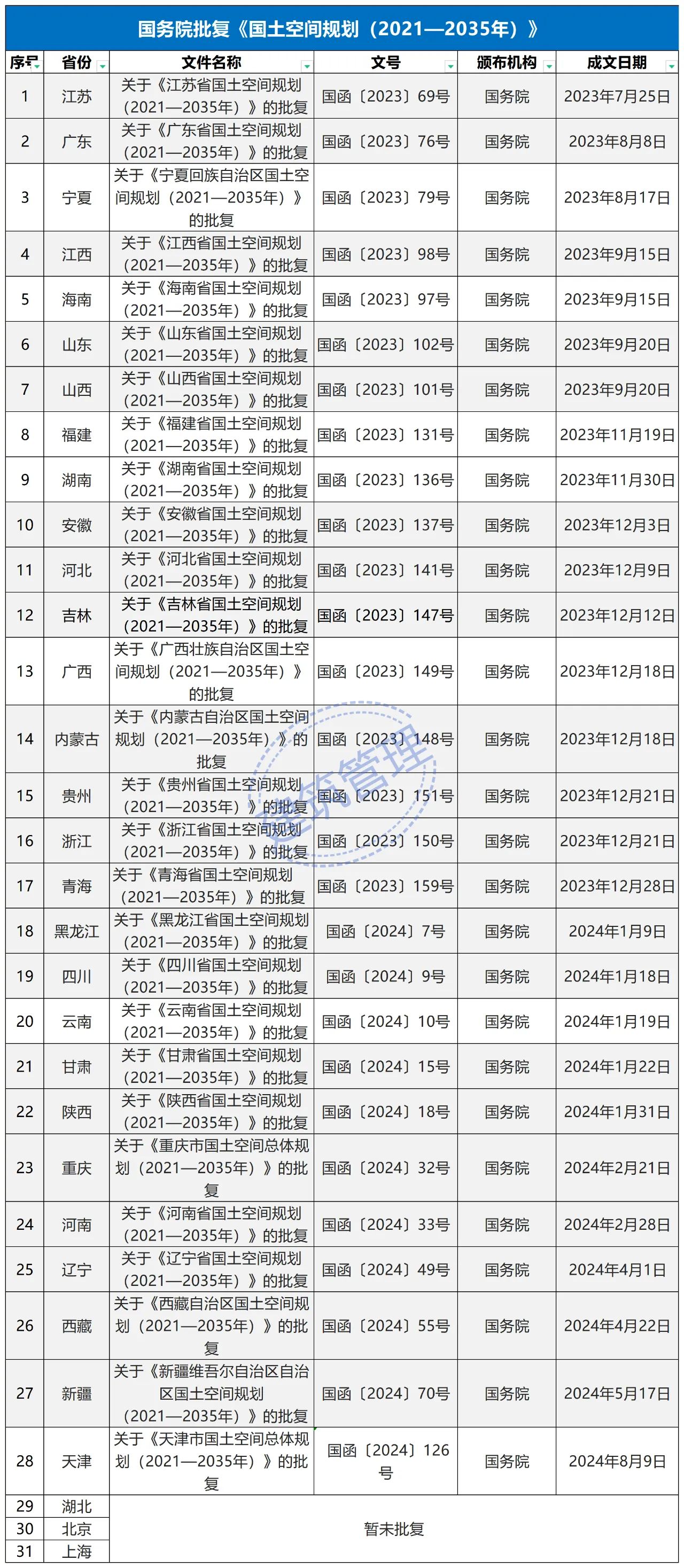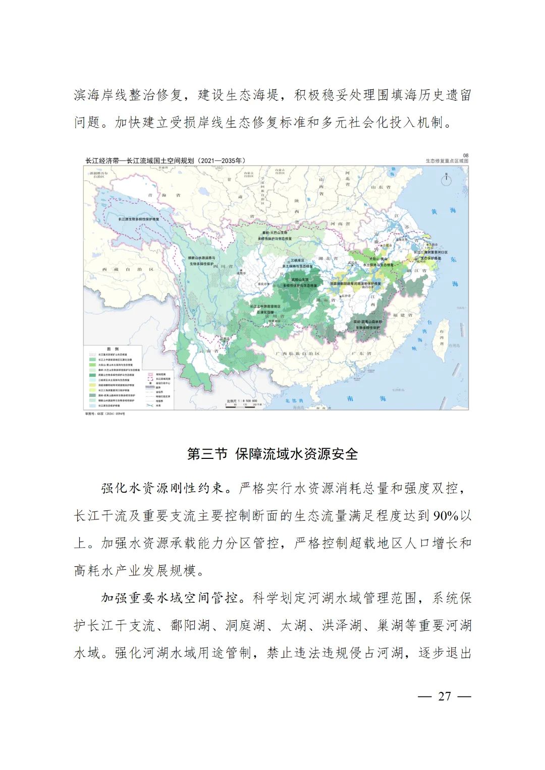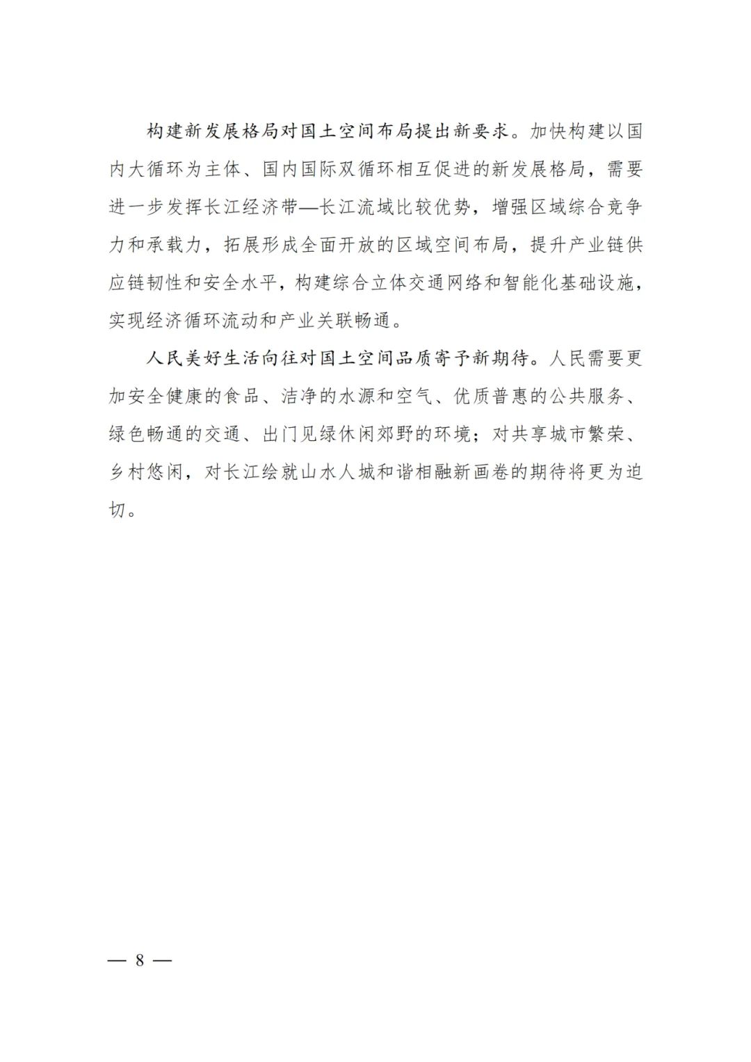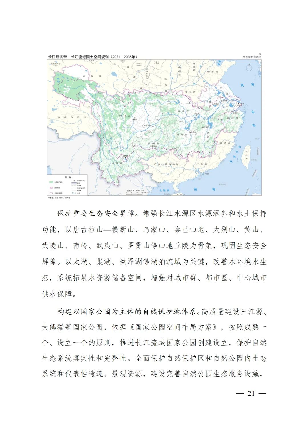2024年2月9日,《长江经济带—长江流域国土空间规划(2021—2035年)》经国务院批复同意。9月10日,自然资源部正式印发《长江经济带—长江流域国土空间规划(2021—2035年)》。规划范围包括长江经济带11个省(市)全域,以及《长江保护法》规定的长江流域其他8省(区、市)的相关县级行政区域,共计1173个县级行政区域。规划范围包括陆域国土和内水、领海。其中,陆域面积240万平方公里。(后附规划范围详细表格)规划期限为2021年至2035年。