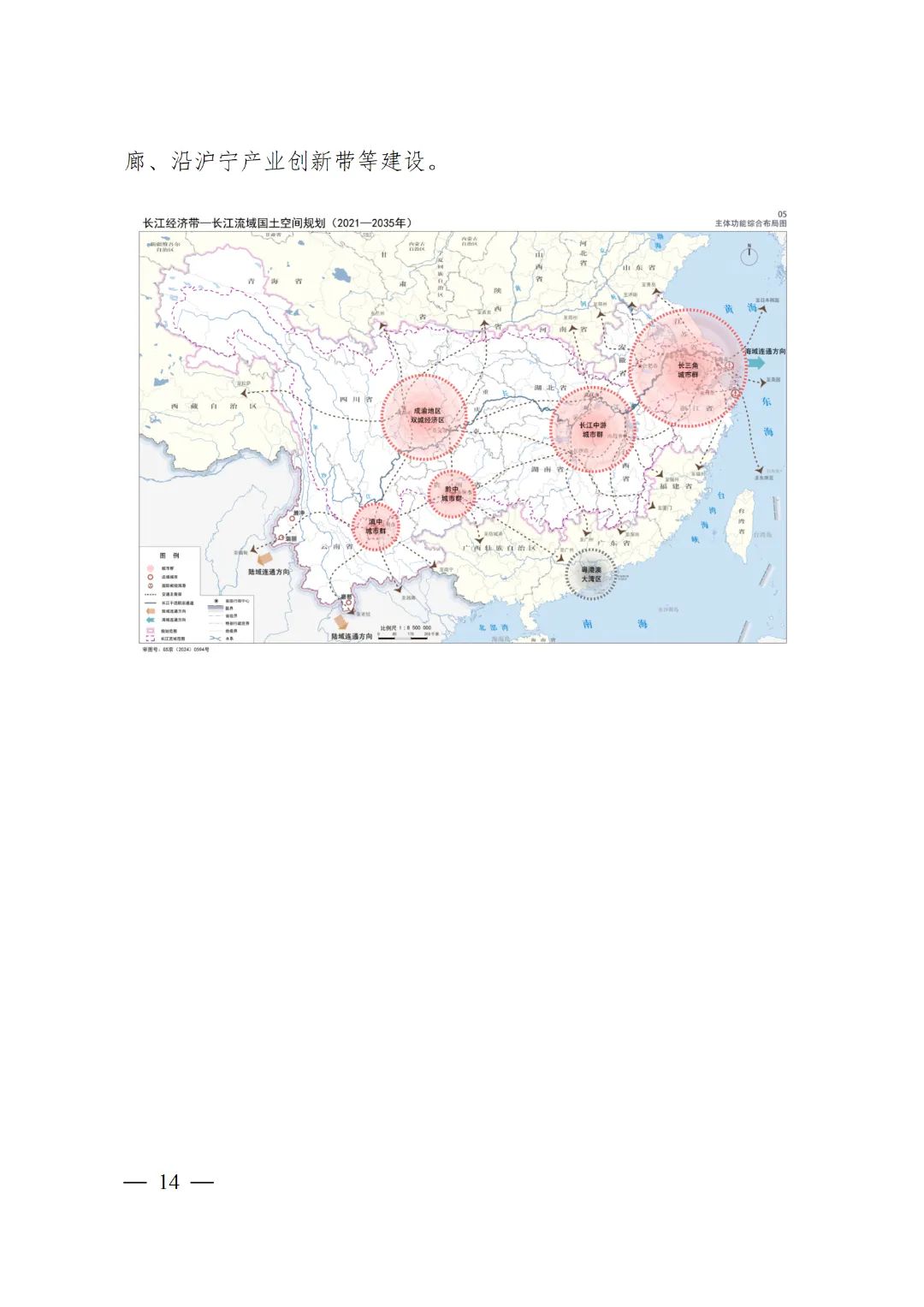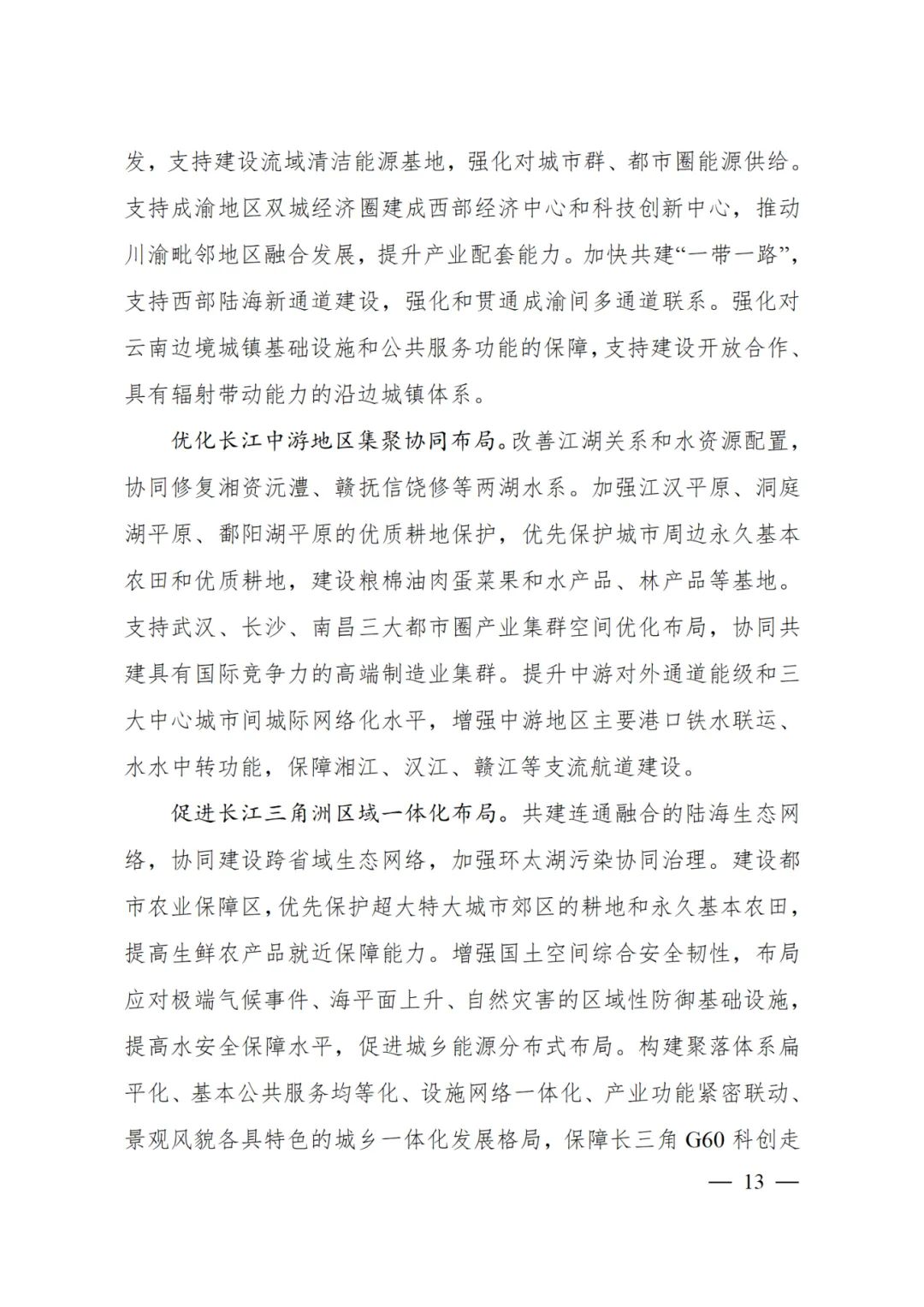 强化长江经济带范围内城市群、都市圈和中心城市网络联结。支持建设沿江、呼南等高速铁路主通道,保障长三角、长江中游、成渝地区双城经济圈与京津冀、珠三角城市群间多径路的高速铁路通道空间需求。
