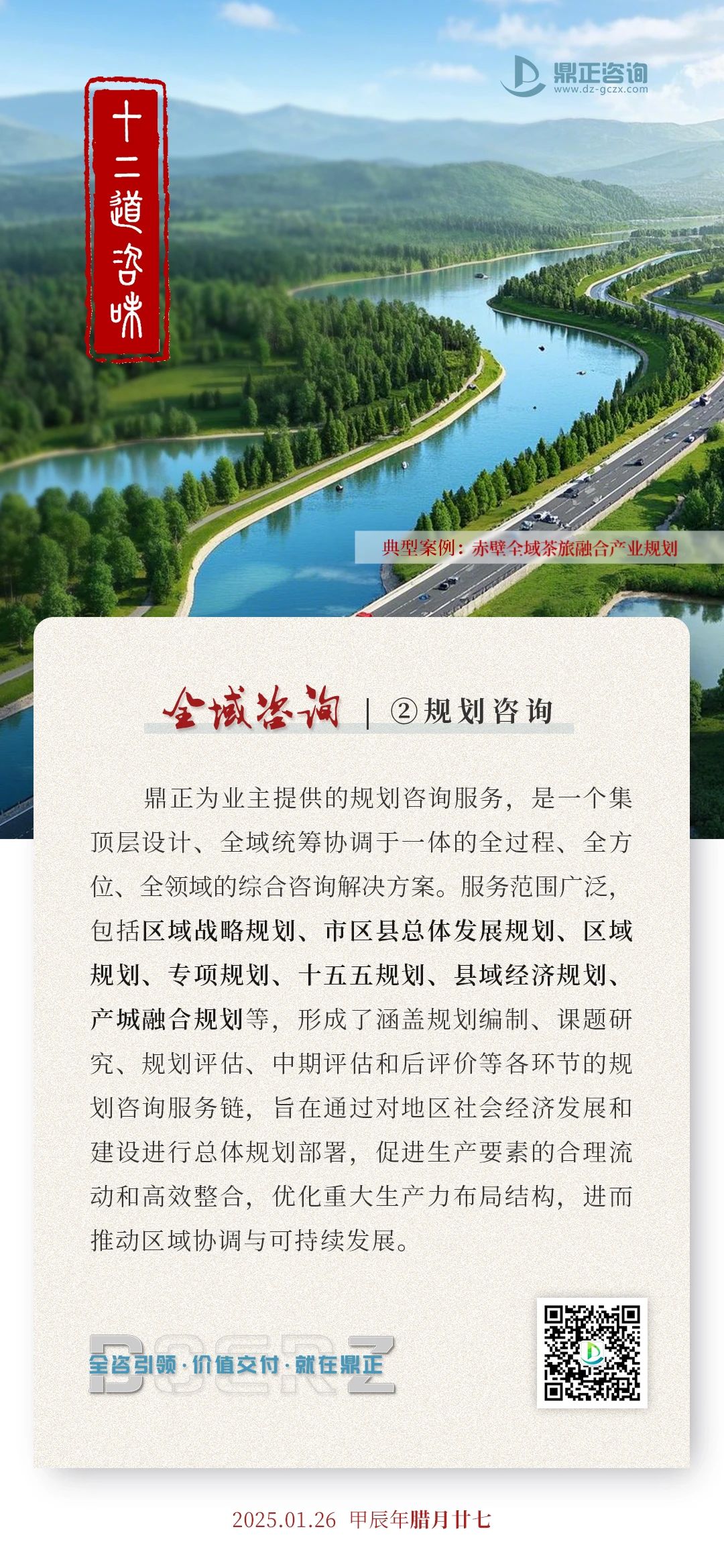 鼎正深入贯彻落实国家战略部署,积极响应新时代发展要求,深化建设新型高端智库,坚定不移为推动国家经济社会高质量发展贡献鼎正智慧。聚焦业务延链,鼎正成功探索并实践了从“全过程工程咨询”向“全域咨询”转型的创新发展路径。全域咨询服务模式通过全域全过程全方位咨询以实现区域效益最大化,其服务涵盖了全域战略空间规划、系统性项目策划、多元化资金申报与筹措、绿色低碳发展以及项目全过程工程咨询等,通过整合多方资源,服务边界能够延伸至纵向到底、横向到边。在这一模式的推动下,我们成功实现了从单一项目服务向区域整体增值的跨越,为客户提供的不仅仅是单纯的咨询服务,更是一种全方位的价值创造。