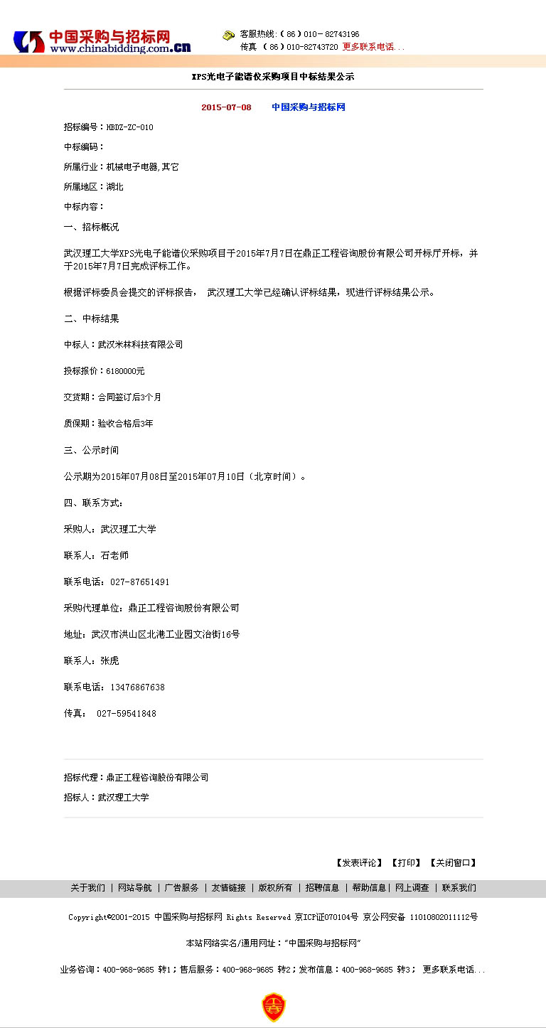 XPS光电子能谱仪采购项目中标结果公示