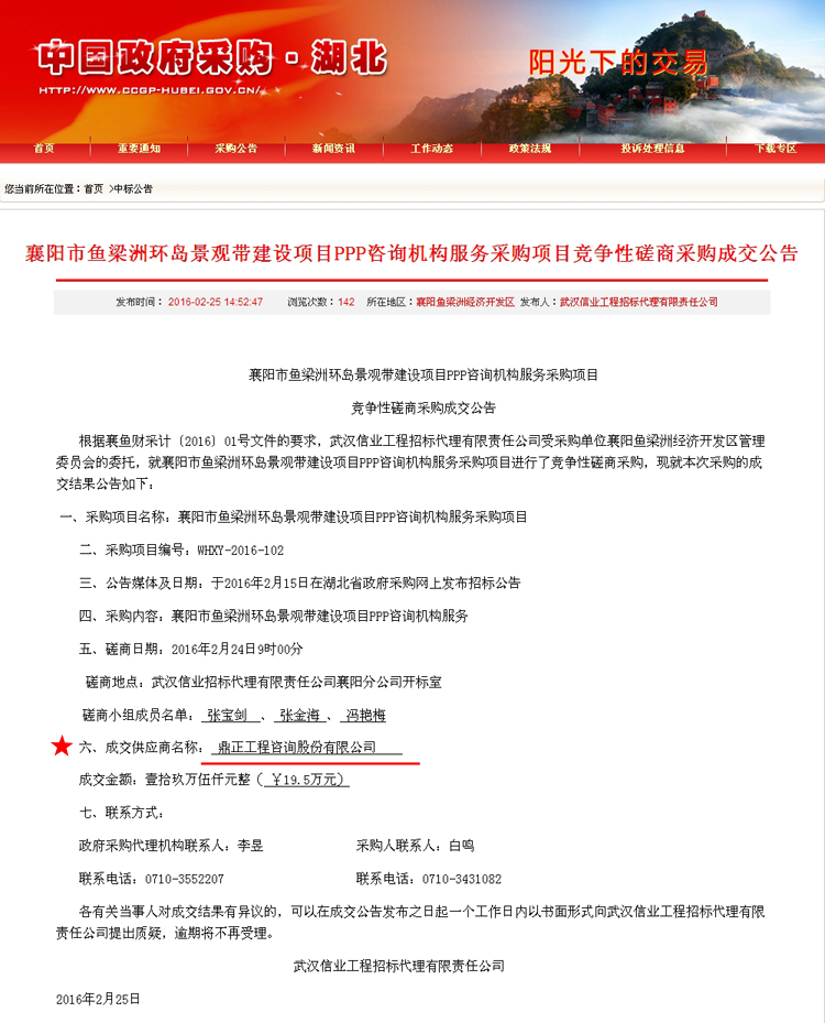 【经营成果】我司中标襄阳市鱼梁洲环岛景观带建设项目PPP咨询机构服务采购项目