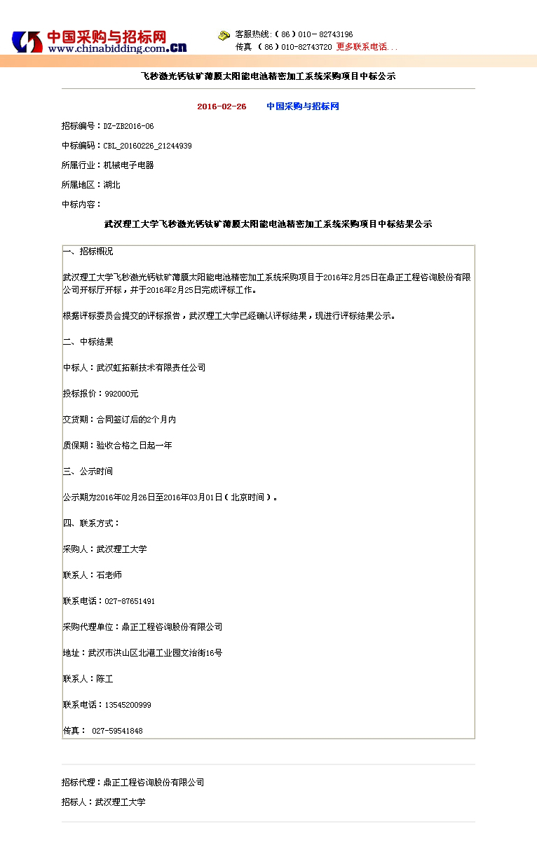 飞秒激光钙钛矿薄膜太阳能电池精密加工系统采购项目中标公示