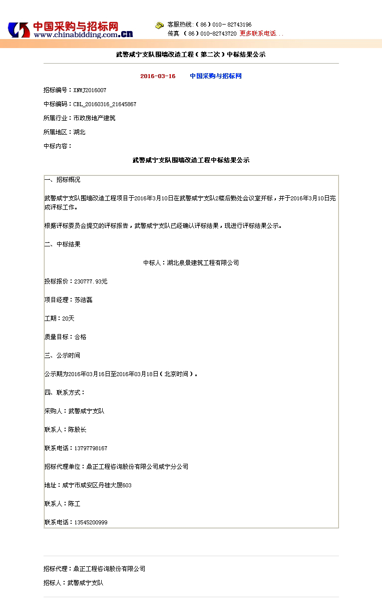 武警咸宁支队围墙改造工程(第二次)中标公示