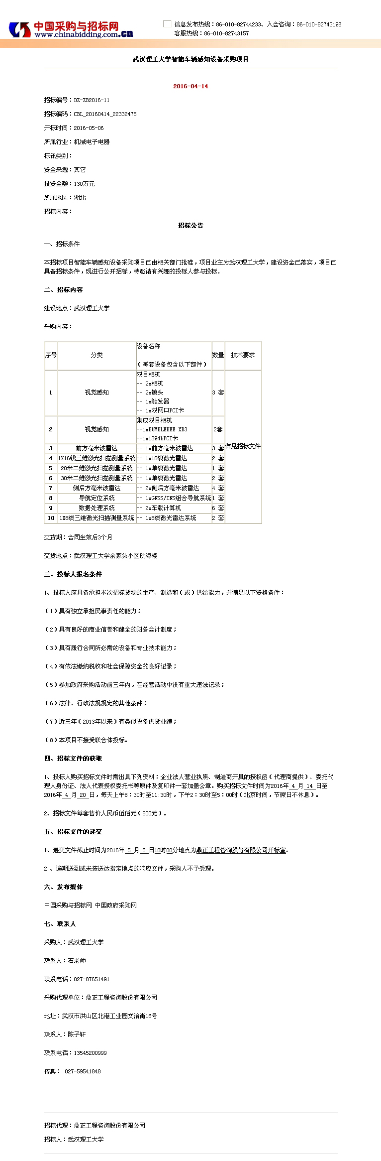 武汉理工大学智能车辆感知设备采购项目招标公告