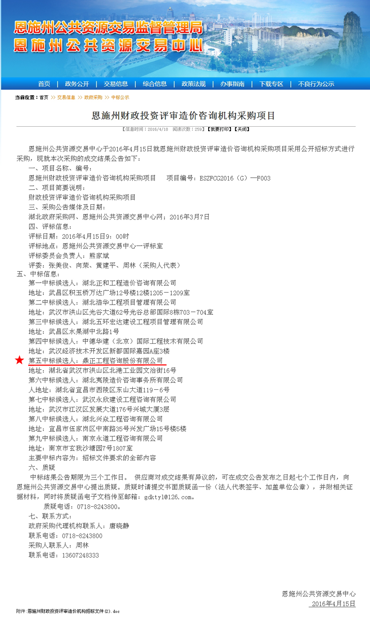 【经营成果】我司中标恩施州财政投资评审造价咨询机构采购项目