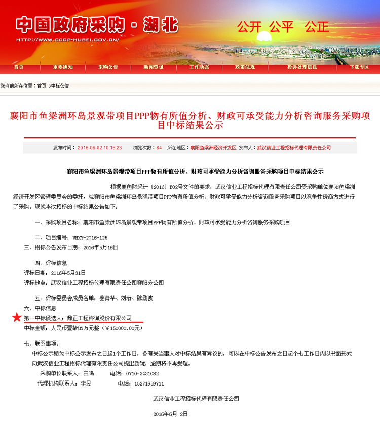 【经营成果】我司中标襄阳市鱼梁洲环岛景观带项目PPP物有所值分析、财政可承受能力分析咨询服务采购项目