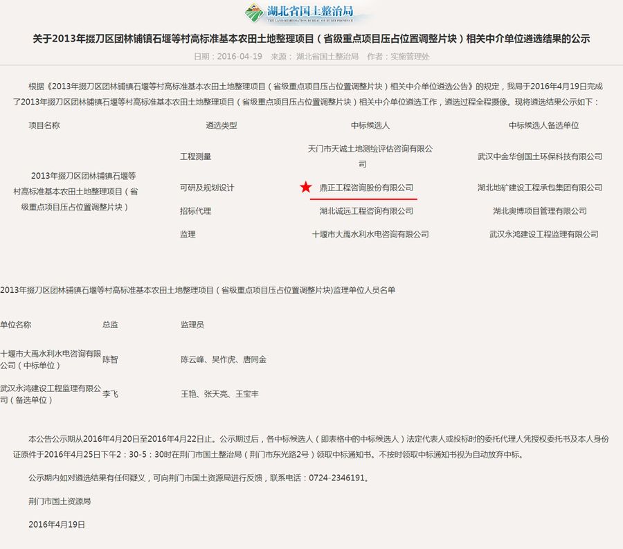 【经营成果】我司入选2013年掇刀区团林铺镇石堰等村高标准基本农田土地整理项目(省级重点项目压占位置调整片块)相关中介单位