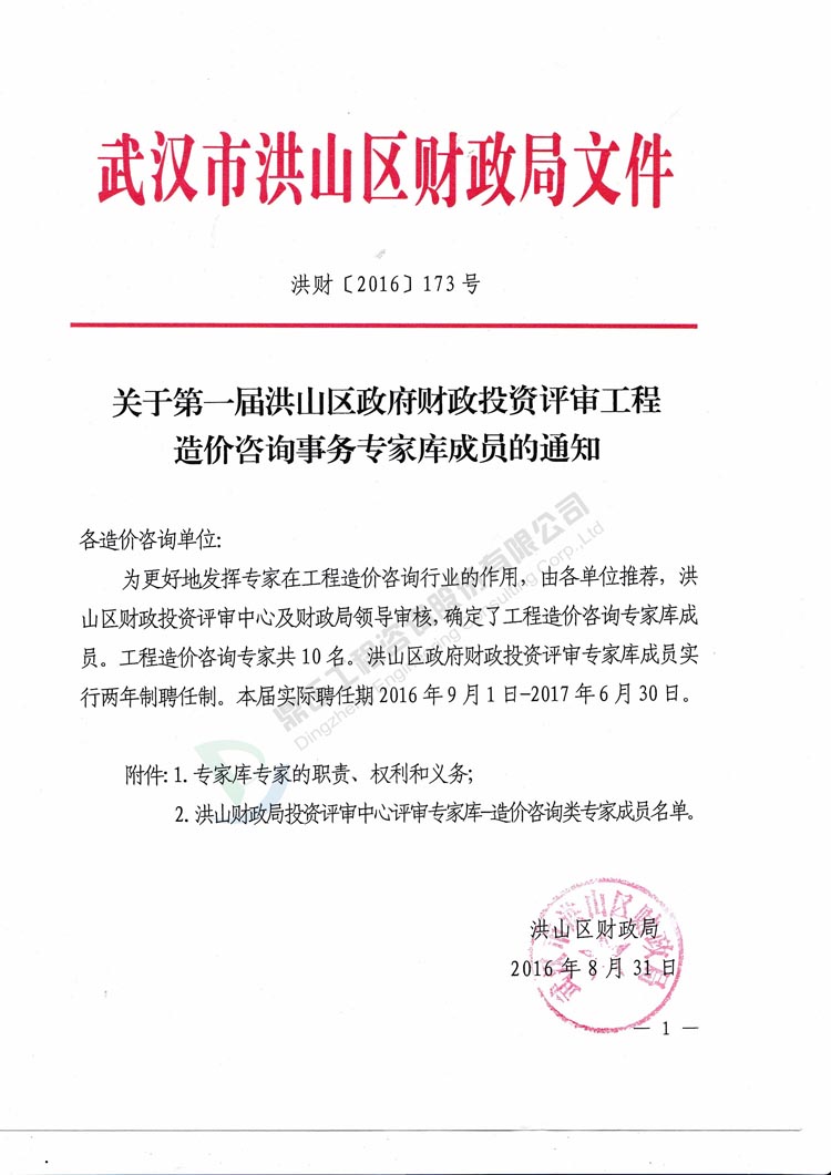 我司李光洲同志被武汉市洪山区财政局特聘为洪山区政府财政投资评审(工程造价咨询事务)专家