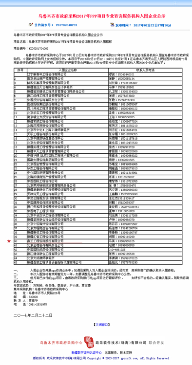 【经营成果】我司成功入围乌鲁木齐市政府采购2017年PPP项目专业咨询服务机构库