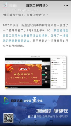 恩施分公司同样通过视频会议的形式,召开了全体员工视频会议,即使大家没有面对面交流,但是也能够通过网络与大家零距离地分享自己在这个特殊春节的所见所闻,作为旁听者,我也感受颇深。疫情期间,恩施分公司接到紧急任务,需对当地民大附属医院新冠病毒试验室项目进行现场勘察,在疫情防范形势下,造价一部的同事们挑起大梁,不畏感染风险,前往现场并且圆满地完成了民大医院新冠病毒实验室项目的招标控制价编制工作。事后,公司徐总、彭总在会上对造价一部的敬业精神进行了表彰。疫情当前,只要政府有需要,公司有能力,我们每一位员工都会勇于上前,这就是鼎正精神!