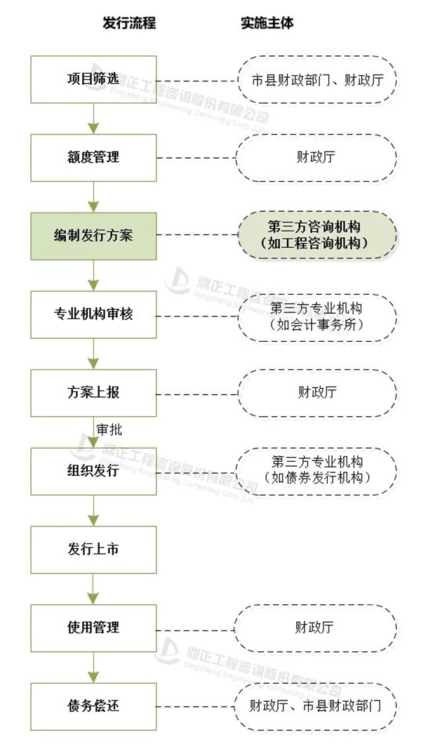 2.执行阶段。由市县级财政部门聘请咨询机构进行方案制定、材料编写,上报省级财政厅进行审核。土地储备、收费公路、棚户区改造专项债按照财政部相关管理办法,省级财政厅在额度范围内报国库司组织发行。其他符合自求平衡条件的重点项目由省级政府制定实施方案及专项债管理办法,报财政部审核通过后,向国库司申请组织发行,通过债券市场完成发行后由省级财政厅转贷给市县。